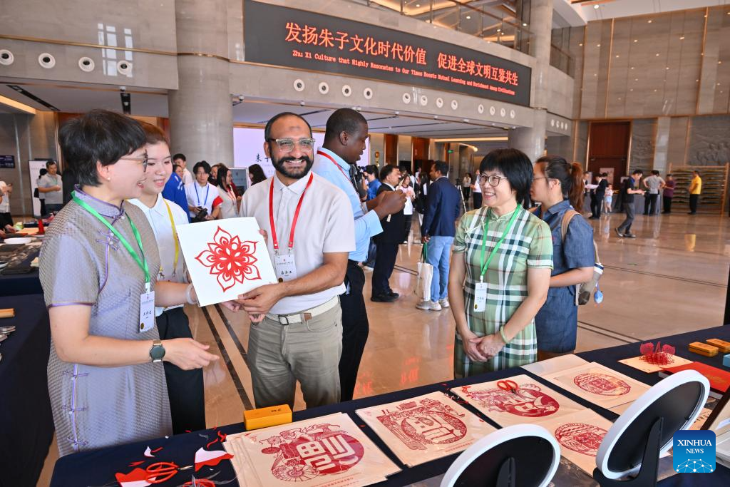 Participants experience paper-cutting at the Conference on Zhu Xi's Philosophy and Dialogue of Global Civilization in Nanping City, southeast China's Fujian Province, Oct. 18, 2025. The Conference on Zhu Xi's Philosophy and Dialogue of Global Civilization was held here on Saturday.