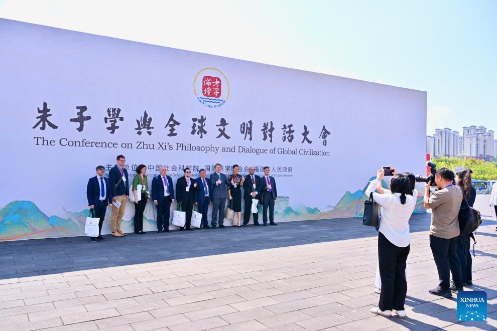 Participants pose for a group photo in front of a board for the Conference on Zhu Xi's Philosophy and Dialogue of Global Civilization in Nanping City, southeast China's Fujian Province, Oct. 18, 2025. The Conference on Zhu Xi's Philosophy and Dialogue of Global Civilization was held here on Saturday.