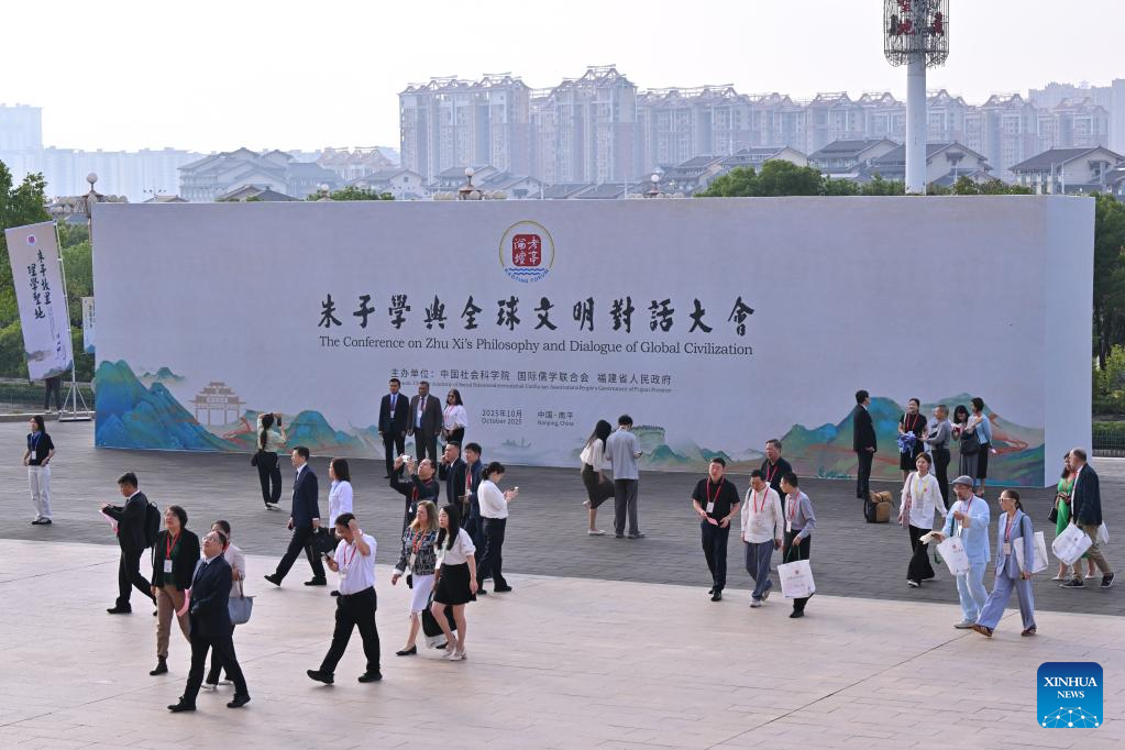 Participants walk past a board for the Conference on Zhu Xi's Philosophy and Dialogue of Global Civilization in Nanping City, southeast China's Fujian Province, Oct. 18, 2025. The Conference on Zhu Xi's Philosophy and Dialogue of Global Civilization was held here on Saturday.