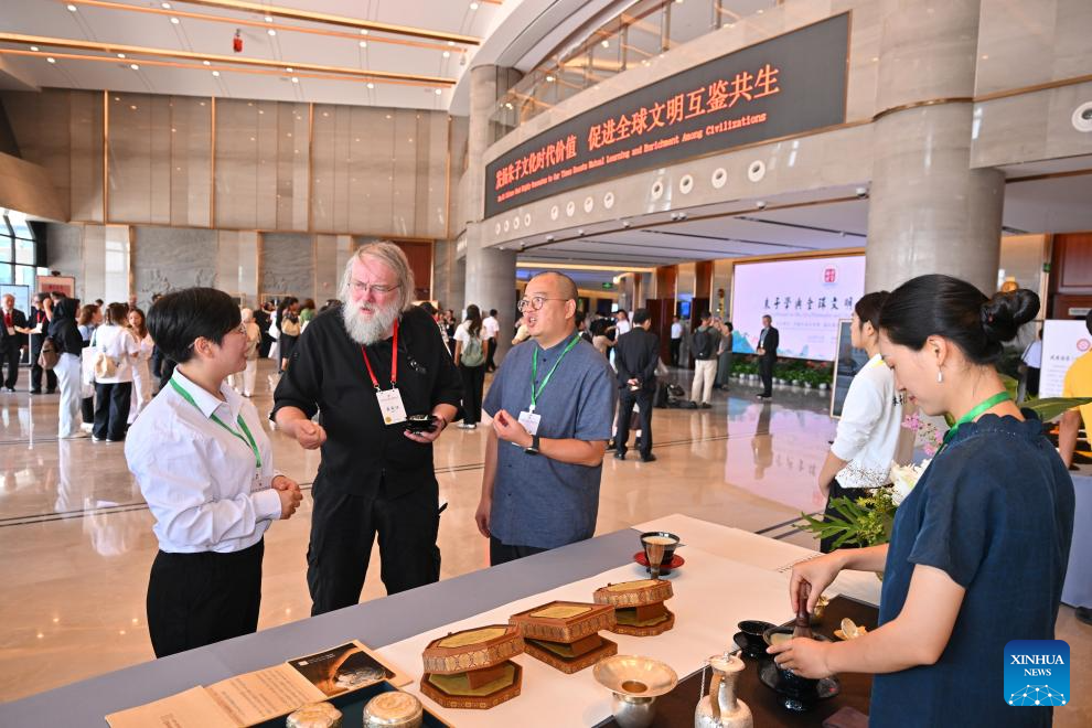 Participants learn about traditional Chinese tea-making technique at the Conference on Zhu Xi's Philosophy and Dialogue of Global Civilization in Nanping City, southeast China's Fujian Province, Oct. 18, 2025. The Conference on Zhu Xi's Philosophy and Dialogue of Global Civilization was held here on Saturday.