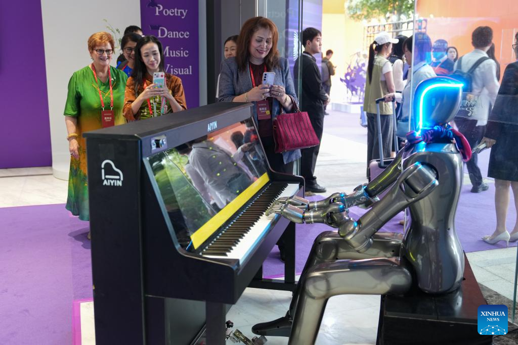 Guests watch a robot playing piano during the World Poetry, Dance, Music and Visual Arts Salon in Hangzhou, east China's Zhejiang Province, Oct. 18, 2025. The World Poetry, Dance, Music and Visual Arts Salon was held here on Saturday as a sideline event of the third Liangzhu Forum. The salon features performances and civilization dialogues, with the participation of more than 20 international artists and cultural scholars. (Xinhua/Huang Zongzhi)