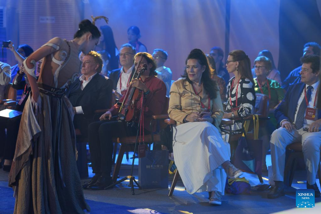 Guests watch a performance staged by a song and dance troupe during the World Poetry, Dance, Music and Visual Arts Salon in Hangzhou, east China's Zhejiang Province, Oct. 18, 2025. The World Poetry, Dance, Music and Visual Arts Salon was held here on Saturday as a sideline event of the third Liangzhu Forum. The salon features performances and civilization dialogues, with the participation of more than 20 international artists and cultural scholars. (Xinhua/Huang Zongzhi)
