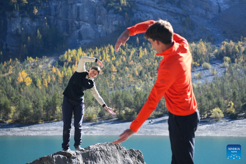 People pose for pictures by the Lake Oeschinen near Kandersteg in Bernese Oberland, Switzerland, Oct. 18, 2025.