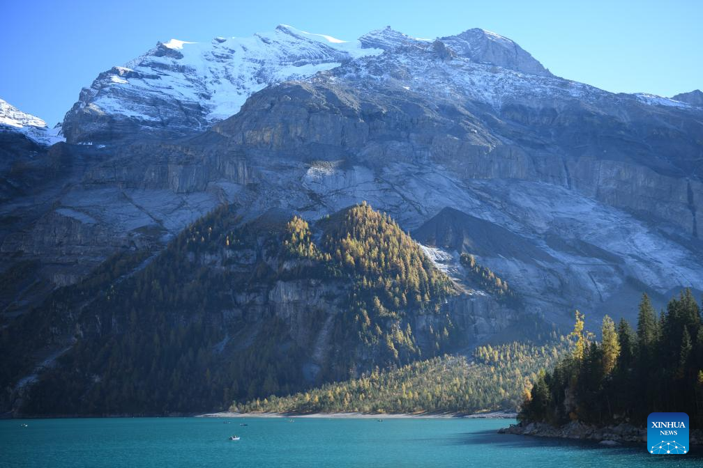 Lake Oeschinen, situated at an altitude of 1,578 meters near Kandersteg in Switzerland's Bernese Oberland, forms part of the UNESCO World Heritage Site "Swiss Alps Jungfrau-Aletsch." (Xinhua/Lian Yi)