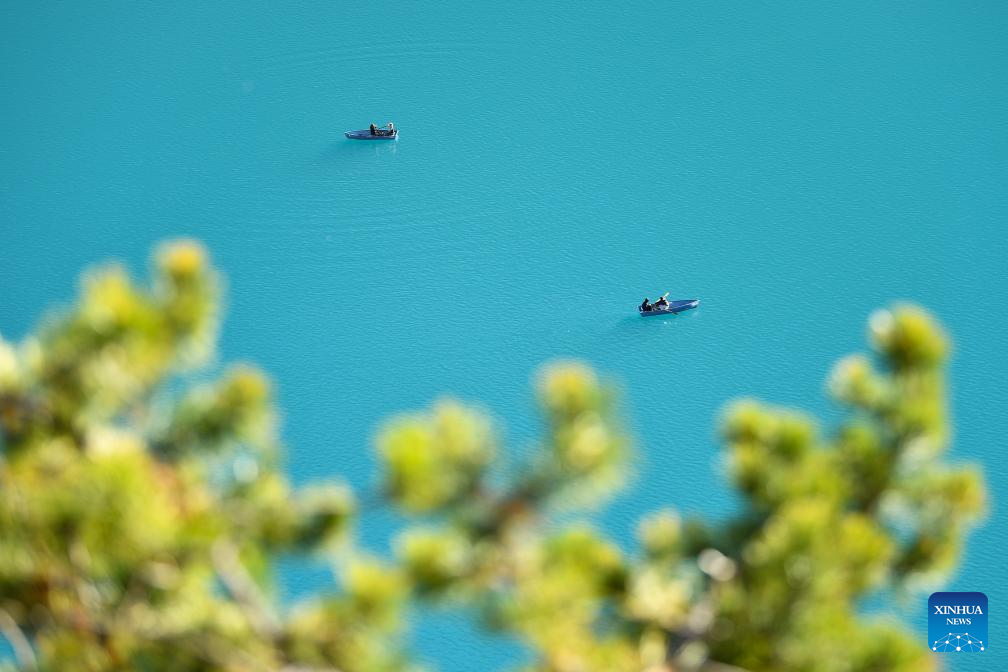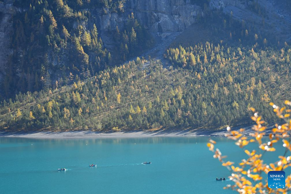 People boat on the Lake Oeschinen near Kandersteg in Bernese Oberland, Switzerland, Oct. 18, 2025.