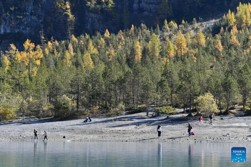 People have fun along the Lake Oeschinen near Kandersteg in Bernese Oberland, Switzerland, Oct. 18, 2025.