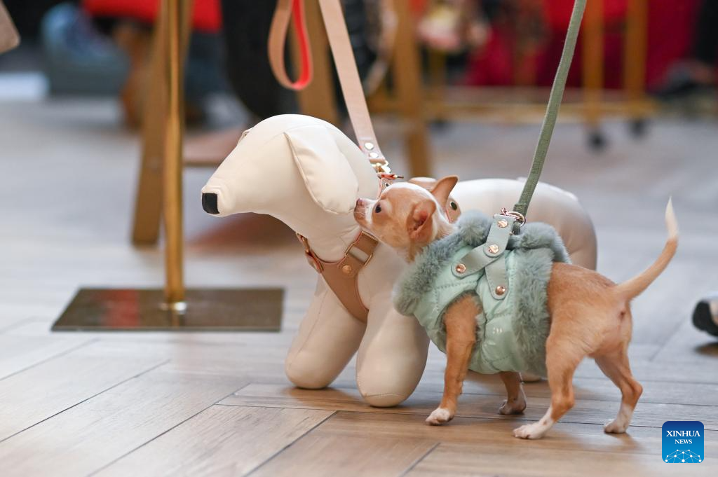 A dog is seen during the "Pupilove" charity pet supplies sale in Warsaw, Poland, Oct. 19, 2025. The charity sale, in cooperation with local animal protection organizations, is regularly held to support animal shelters in several cities in Poland. (Photo by Aleksy Witwicki/Xinhua)