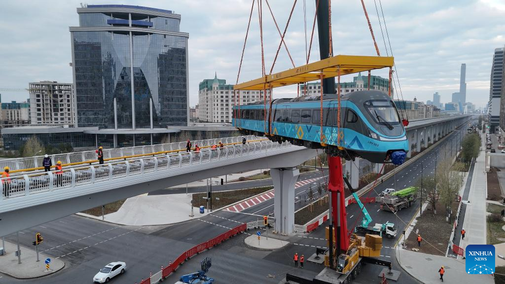 A light rail train is lifted onto the track in Astana, Kazakhstan, Oct. 19, 2025. Two trains for the Astana Light Rail Transit (LRT) project have arrived in the Kazakh capital and were lifted into place from October 16 to 19 to advance testing work, according to the city administration. (Photo by Kalizhan Ospanov/Xinhua)