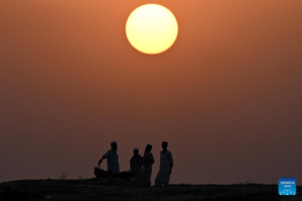 This photo taken on Oct. 19, 2025 shows the silhouette of people chatting with each other during sunset on the outskirts of Islamabad, capital of Pakistan. (Xinhua/Ahmad Kamal)
