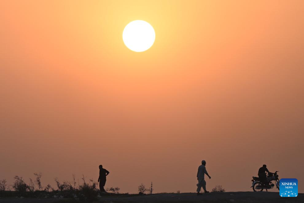 This photo taken on Oct. 19, 2025 shows the silhouette of people during sunset on the outskirts of Islamabad, capital of Pakistan. (Xinhua/Ahmad Kamal)