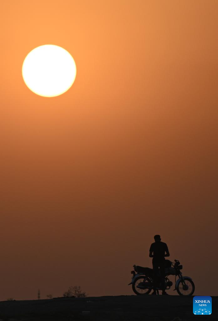 This photo taken on Oct. 19, 2025 shows the silhouette of a man standing near his motorbike during sunset on the outskirts of Islamabad, capital of Pakistan. (Xinhua/Ahmad Kamal)