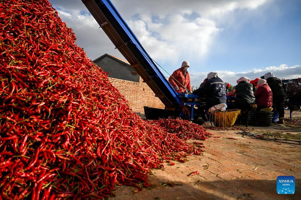 Villagers sort chilies in Liuhetang Village, Kailu County of Tongliao City, north China's Inner Mongolia Autonomous Region, Oct. 19, 2025. Chilies cultivated in Kailu County have recently entered the harvest season. Currently, Kailu has around 600,000 mu (about 40,000 hectares) of chili cultivation area. (Xinhua/Lian Zhen)