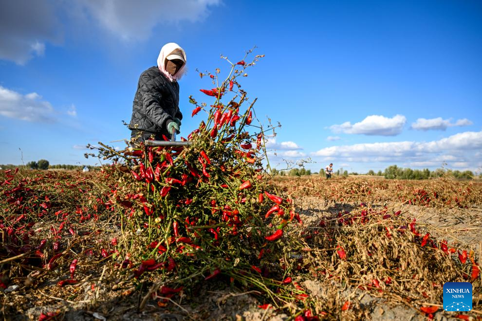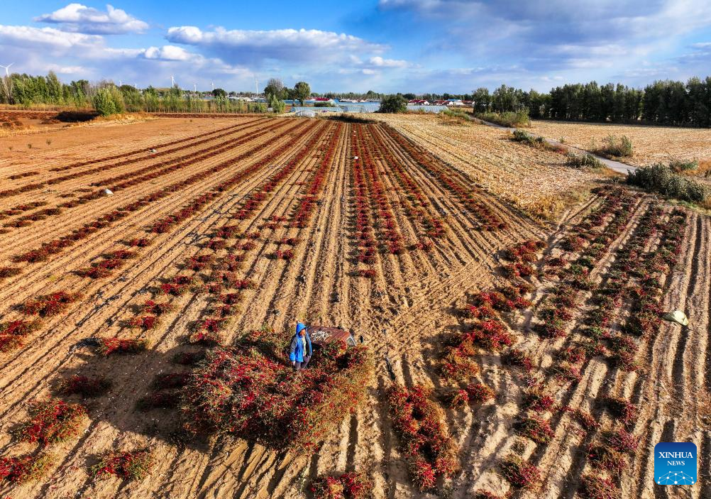 A villager dries chilies at a field in Liuhetang Village, Kailu County of Tongliao City, north China's Inner Mongolia Autonomous Region, Oct. 19, 2025. Chilies cultivated in Kailu County have recently entered the harvest season. Currently, Kailu has around 600,000 mu (about 40,000 hectares) of chili cultivation area. (Xinhua/Lian Zhen)