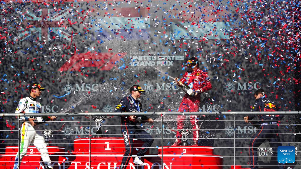 Winner Red Bull's Dutch driver Max Verstappen (2nd L), second placed McLaren's British driver Lando Norris (1st L) and third placed Ferrari's Monegasque driver Charles Leclerc (2nd R) celebrate during the awarding ceremony after the race of the 2025 Formula One United States Grand Prix in Austin, Texas, the United States, Oct. 19, 2025. (Xinhua/Wu Xiaoling)