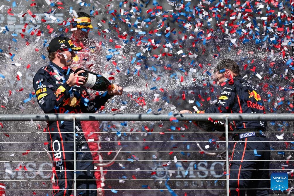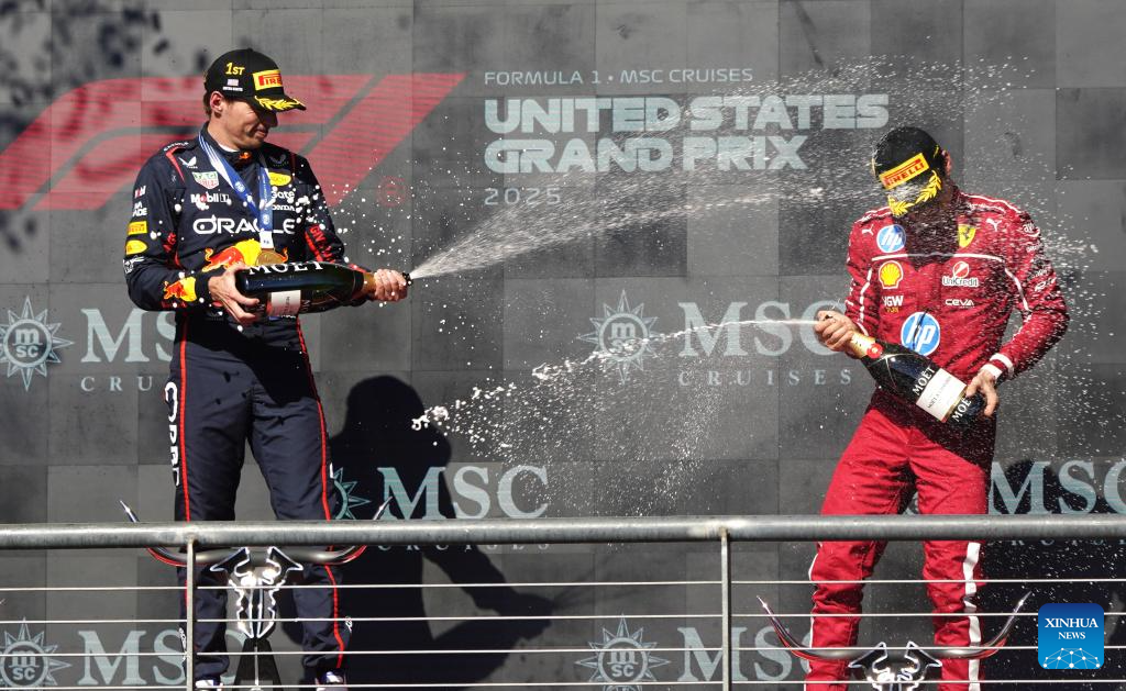 Winner Red Bull's Dutch driver Max Verstappen (L) and third placed Ferrari's Monegasque driver Charles Leclerc celebrate during the awarding ceremony after the race of the 2025 Formula One United States Grand Prix in Austin, Texas, the United States, Oct. 19, 2025. (Xinhua/Wu Xiaoling)
