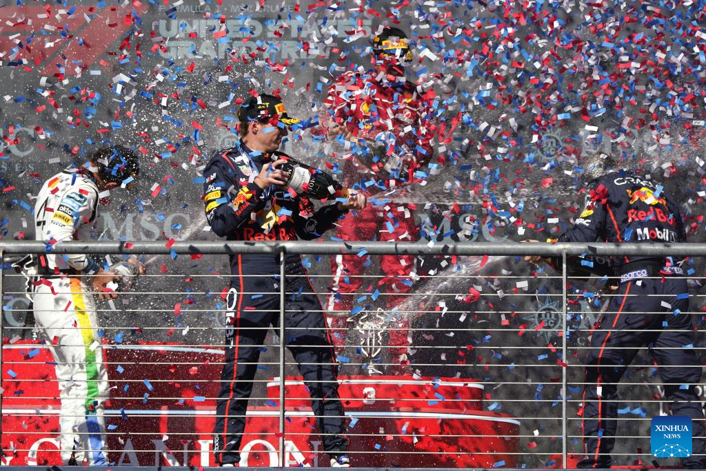 Winner Red Bull's Dutch driver Max Verstappen celebrates during the awarding ceremony after the race of the 2025 Formula One United States Grand Prix in Austin, Texas, the United States, Oct. 19, 2025. (Xinhua/Wu Xiaoling)