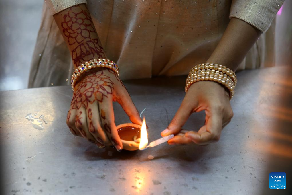 A woman lights an oil lamp to celebrate Diwali, or the Hindu festival of lights, in Yangon, Myanmar, Oct. 20, 2025. (Xinhua/Myo Kyaw Soe)
