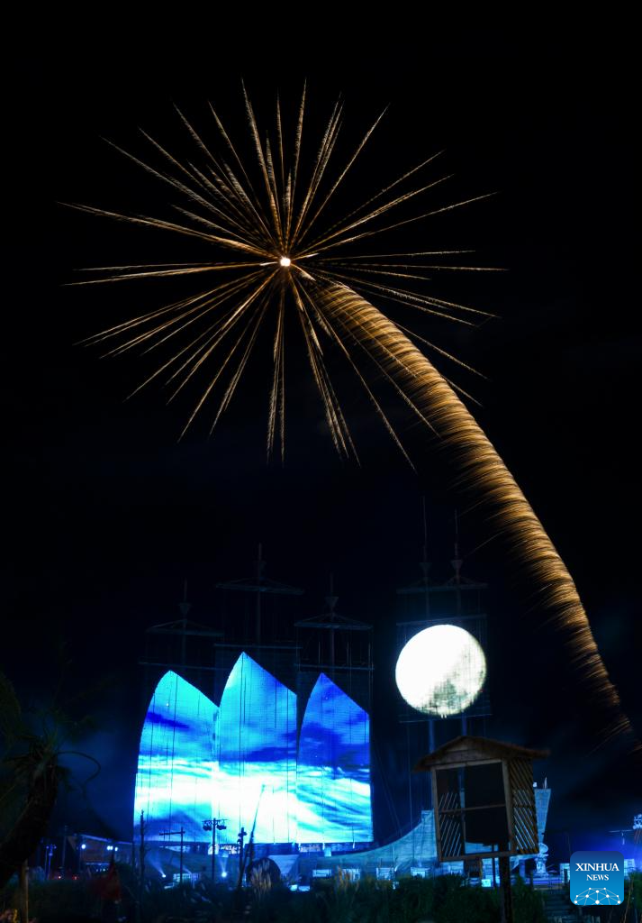 This photo taken on Oct. 20, 2025 shows a fireworks show at a scenic area in Hepu County of Beihai City, south China's Guangxi Zhuang Autonomous Region.