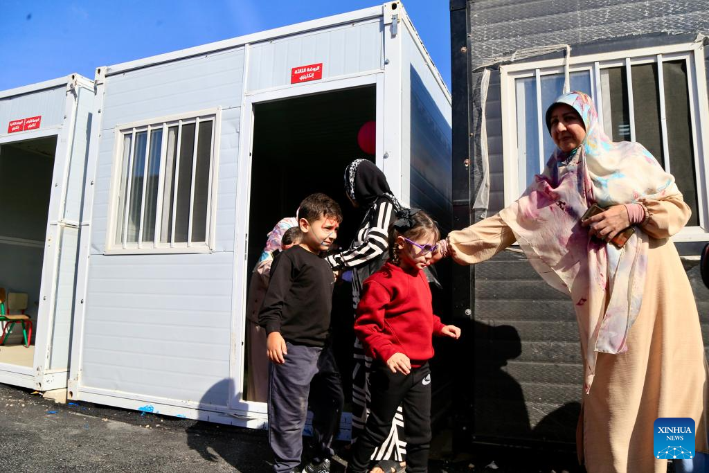 Students attend their first day of classes in prefabricated rooms at a temporary school in Meiss El Jabal, southern Lebanon, Oct. 20, 2025. The temporary school here was established to replace three schools destroyed by Israeli strikes last year, allowing students to resume their studies in the new school year. (Photo by Ali Hashisho/Xinhua)