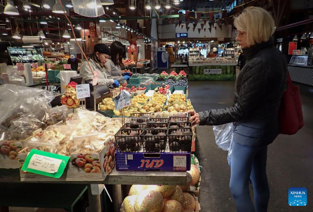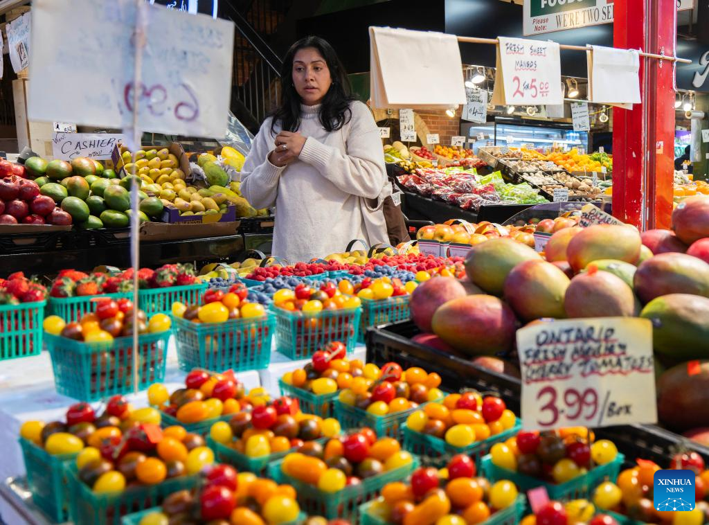 A customer shops for food at a public market in Vancouver, Canada, Oct. 21, 2025. (Photo by Liang Sen/Xinhua)