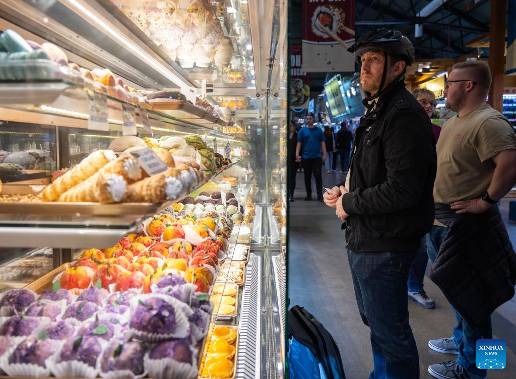 Customers shop for food at a public market in Vancouver, Canada, Oct. 21, 2025. (Photo by Liang Sen/Xinhua)