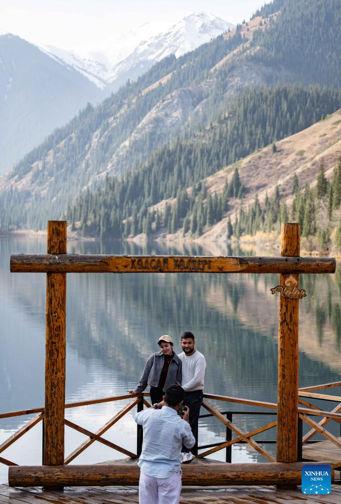 Tourists pose for photos at the Kolsai Lakes National Park in Almaty Region, Kazakhstan, on Oct. 21, 2025. (Xinhua/Li Renzi)