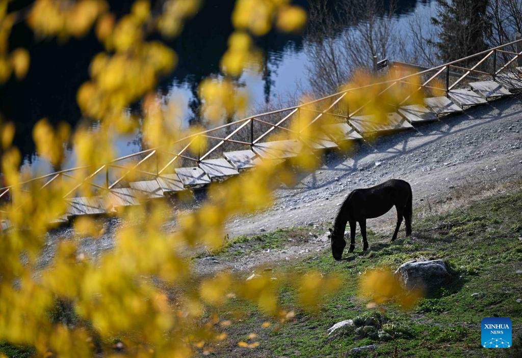 This photo taken on Oct. 21, 2025 shows a horse at the Kolsai Lakes National Park in Almaty Region, Kazakhstan. (Xinhua/Li Renzi)