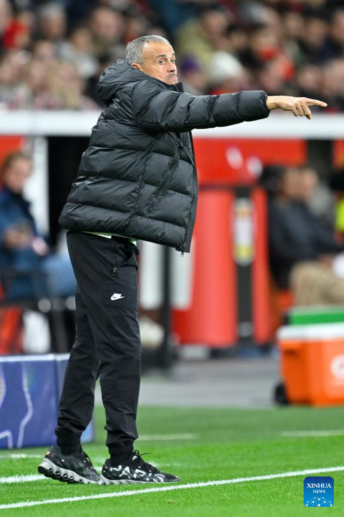 Paris Saint-Germain's head coach Luis Enrique reacts during the UEFA Champions League group stage 3rd round match between Bayer 04 Leverkusen and Paris Saint Germain in Leverkusen, Germany, Oct. 21, 2025. (Photo by Ulrich Hufnagel/Xinhua)