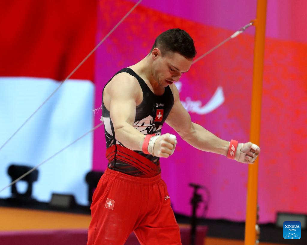 Noe Seifert of Switzerland celebrates after the Horizontal Bar of the Men's All-Round Final at the 53rd FIG Artistic Gymnastics World Championships in Jakarta, Indonesia, on Oct. 22, 2025. (Xinhua/Cen Yunpeng)
