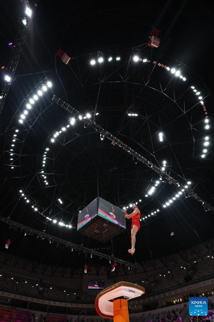Zhang Boheng of China competes during the Pommel Horse of Men's All-Round Final at the 53rd FIG Artistic Gymnastics World Championships in Jakarta, Indonesia, on Oct. 22, 2025. (Xinhua/Cen Yunpeng)