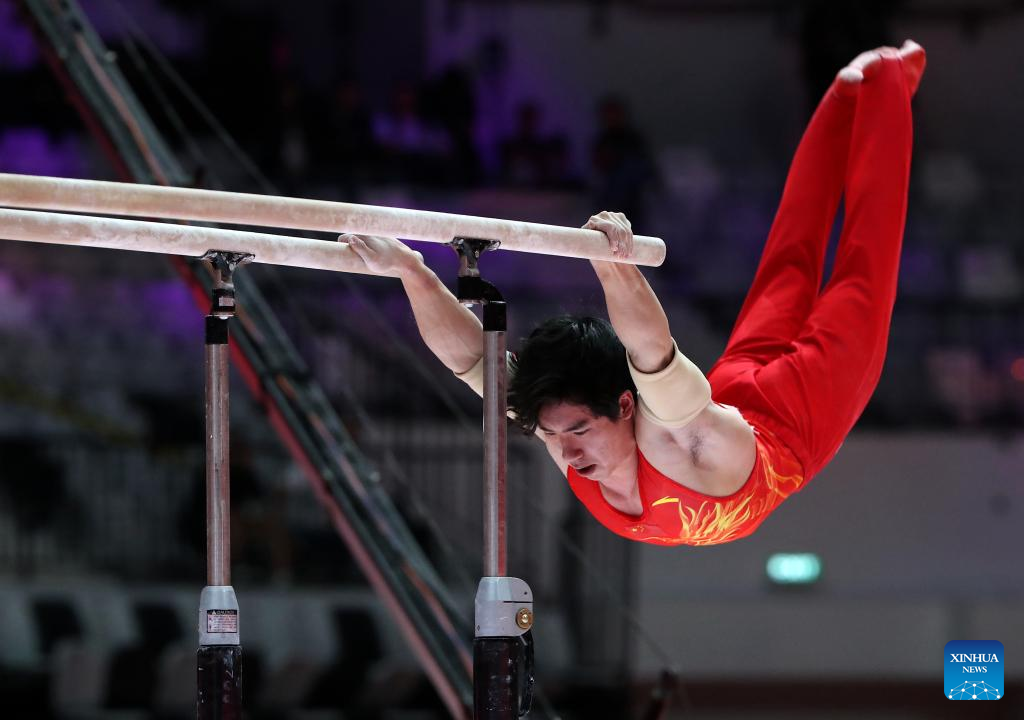 Zhang Boheng of China competes during the Parallel Bars of Men's All-Round Final at the 53rd FIG Artistic Gymnastics World Championships in Jakarta, Indonesia, on Oct. 22, 2025. (Xinhua/Cen Yunpeng)