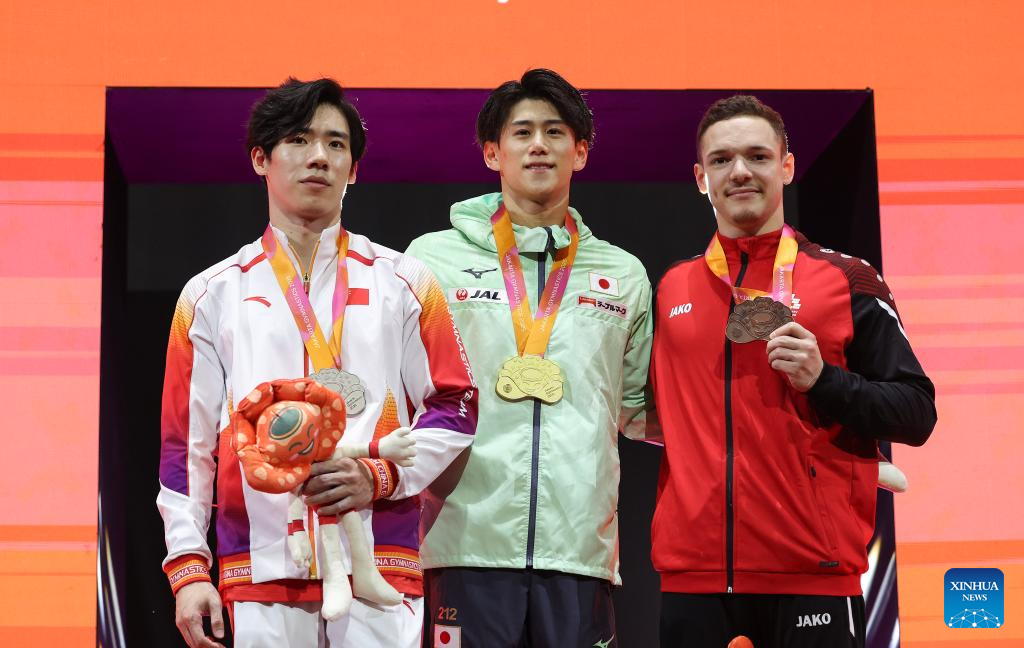 Gold medalist Hashimoto Daiki (C) of Japan, silver medalist Zhang Boheng (L) of China and bronze medalist Noe Seifert of Switzerland pose for photos during the awarding ceremony for Men's All-Round at the 53rd FIG Artistic Gymnastics World Championships in Jakarta, Indonesia, on Oct. 22, 2025. (Xinhua/Bai Xuefei)