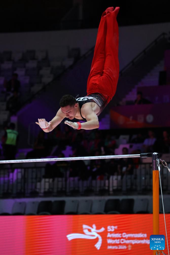 Noe Seifert of Switzerland competes during the Horizontal Bar of the Men's All-Round Final at the 53rd FIG Artistic Gymnastics World Championships in Jakarta, Indonesia, on Oct. 22, 2025. (Xinhua/Cen Yunpeng)