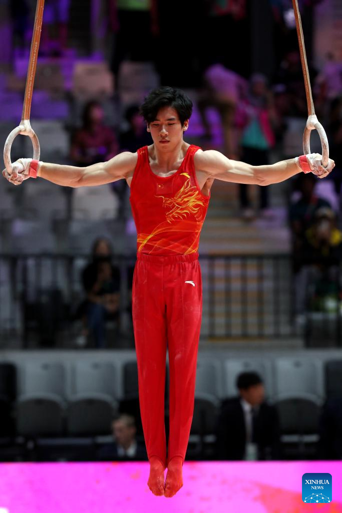 Shi Cong of China competes during the Rings of Men's All-Round Final at the 53rd FIG Artistic Gymnastics World Championships in Jakarta, Indonesia, on Oct. 22, 2025. (Xinhua/Cen Yunpeng)