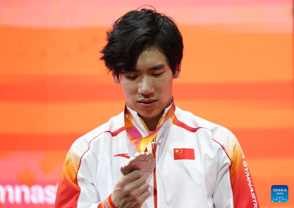 Silver medalist Zhang Boheng of China reacts during the awarding ceremony for Men's All-Round at the 53rd FIG Artistic Gymnastics World Championships in Jakarta, Indonesia, on Oct. 22, 2025. (Xinhua/Bai Xuefei)
