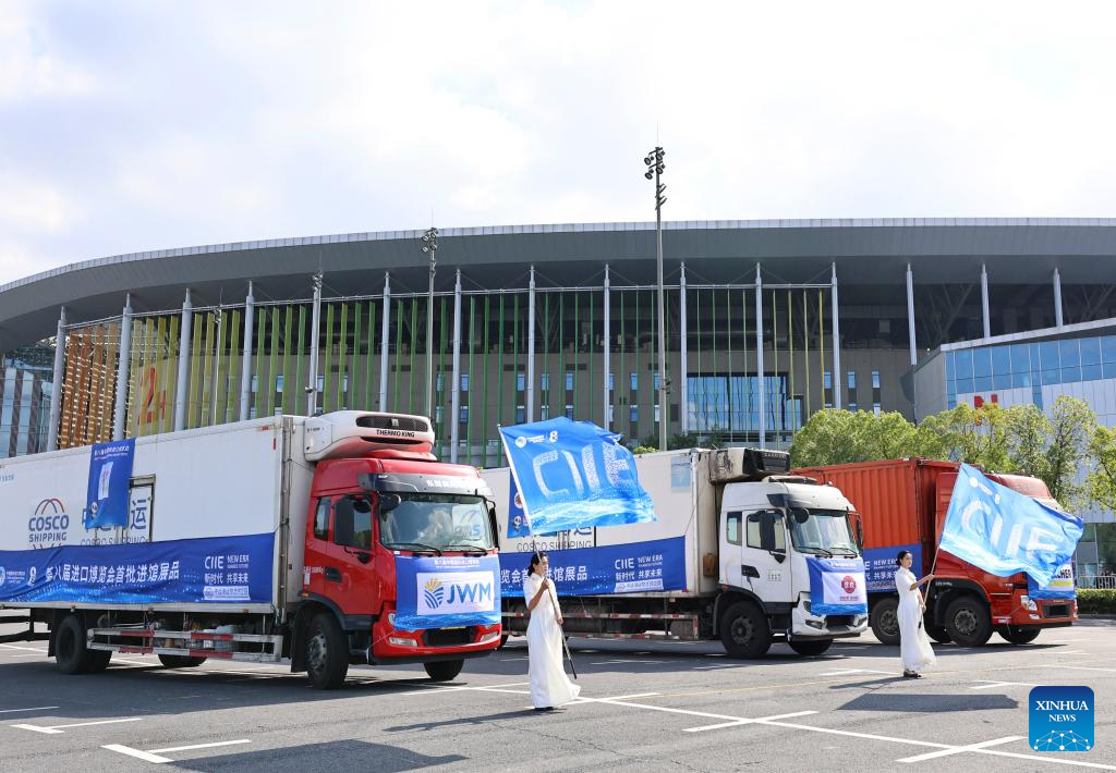 Trucks loaded with exhibits for the upcoming 8th China International Import Expo (CIIE) are seen during a ceremony marking the arrival of exhibits at the National Exhibition and Convention Center (Shanghai), the main venue for the CIIE, in east China's Shanghai, Oct. 23, 2025. The first batch of exhibits for the exhibition areas of Intelligent Industry and Information Technology, Food and Agricultural Products, and Medical Equipment & Healthcare Products of the 8th CIIE arrived at the National Exhibition and Convention Center (Shanghai) on Thursday. (Xinhua/Fang Zhe)