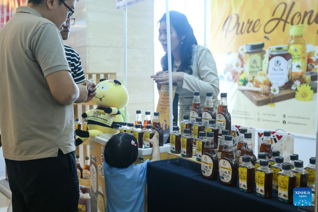 Honey products of Plan Bee Social Enterprise are shown during an exhibition in Yangon, Myanmar, Oct. 24, 2025. (Xinhua/Myo Kyaw Soe)