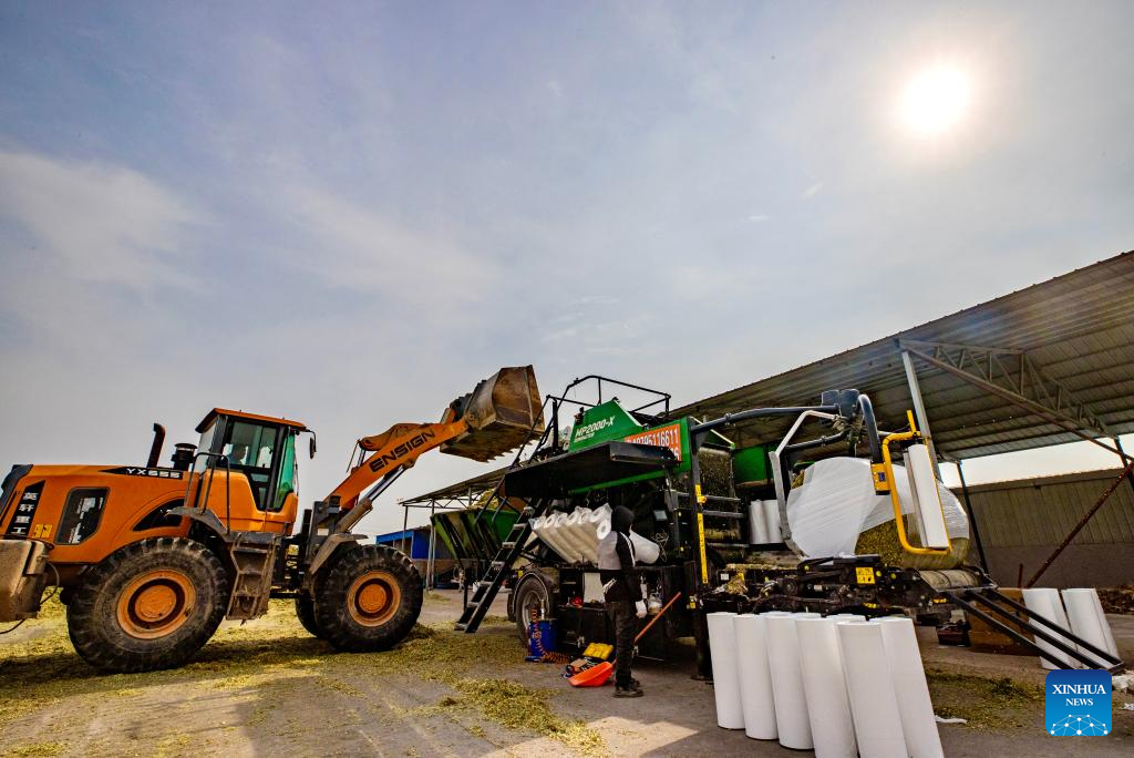 This photo taken on Oct. 23, 2025 shows farmers packing harvested giant Juncao in Minning Town of Yongning County in Yinchuan, northwest China's Ningxia Hui Autonomous Region. Giant Juncao cultivated in Minning Town of Yongning County has recently entered the harvest season. The harvested giant Juncao will be used as silage to support the development of the cattle and sheep breeding industry. (Xinhua/Yang Zhisen)