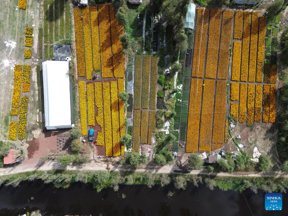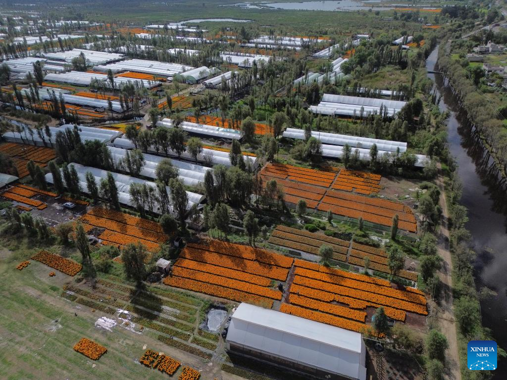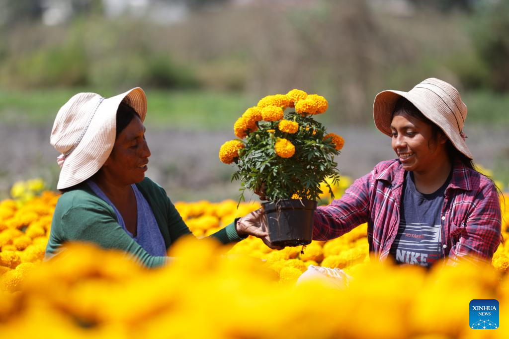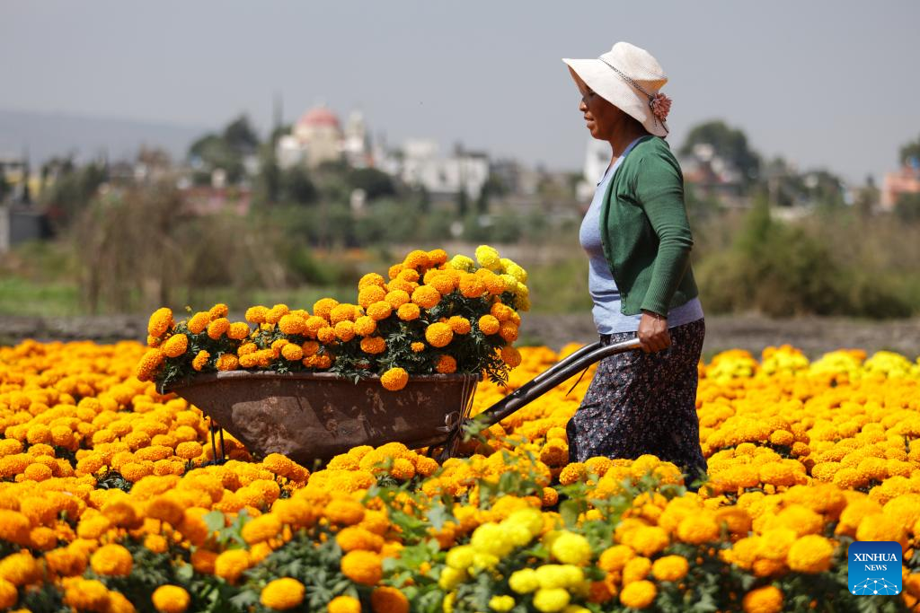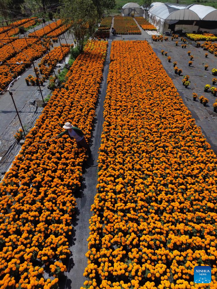 This photo taken on Oct. 21, 2025 shows a field of marigold flowers in Mexico City, capital of Mexico. Every year on Nov. 1 and 2, Mexicans celebrate the Day of the Dead. In the days leading up to the festival, fields of marigolds are harvested and brought to markets, eventually adorning streets, homes, and cemeteries across the country. (Photo by Francisco Canedo/Xinhua)