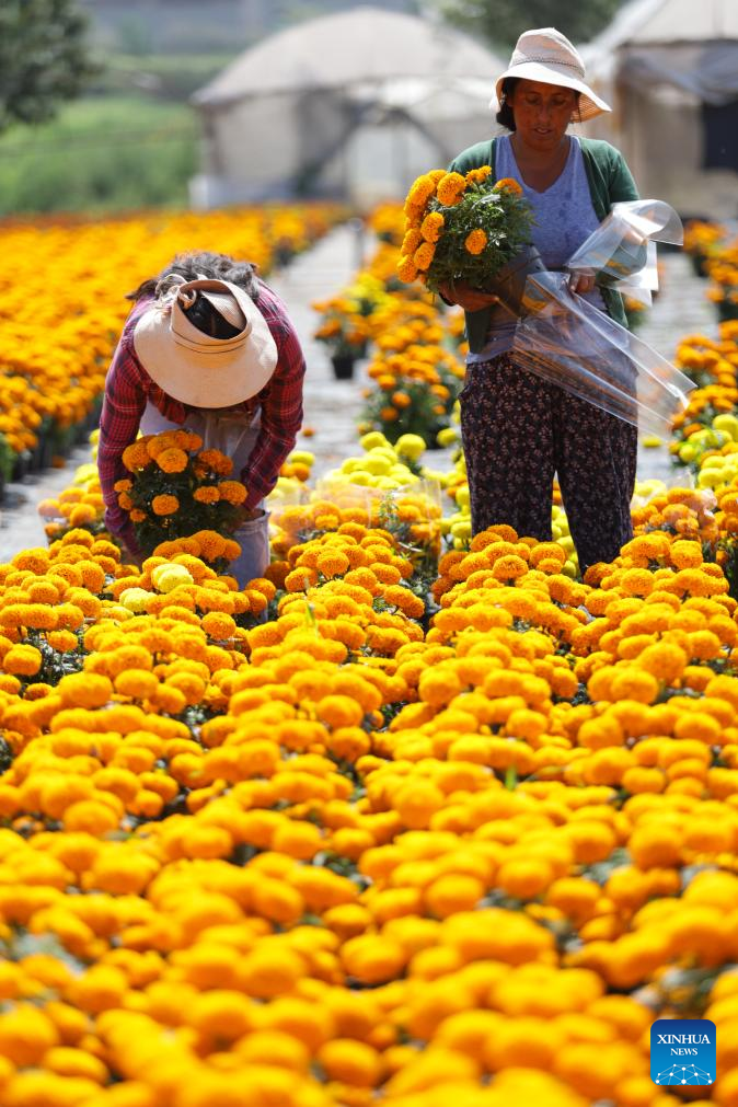 Farmers harvest marigold flowers in Mexico City, capital of Mexico, Oct. 21, 2025. Every year on Nov. 1 and 2, Mexicans celebrate the Day of the Dead. In the days leading up to the festival, fields of marigolds are harvested and brought to markets, eventually adorning streets, homes, and cemeteries across the country. (Photo by Francisco Canedo/Xinhua)