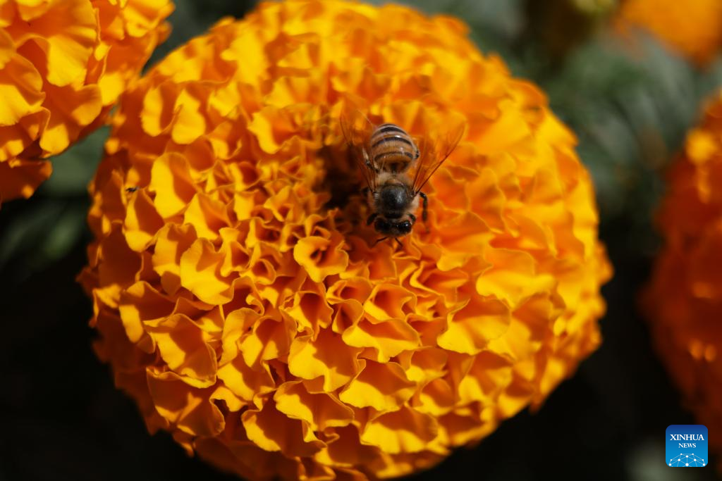 This photo taken on Oct. 21, 2025 shows a honeybee on a marigold flower in Mexico City, capital of Mexico. Every year on Nov. 1 and 2, Mexicans celebrate the Day of the Dead. In the days leading up to the festival, fields of marigolds are harvested and brought to markets, eventually adorning streets, homes, and cemeteries across the country. (Photo by Francisco Canedo/Xinhua)