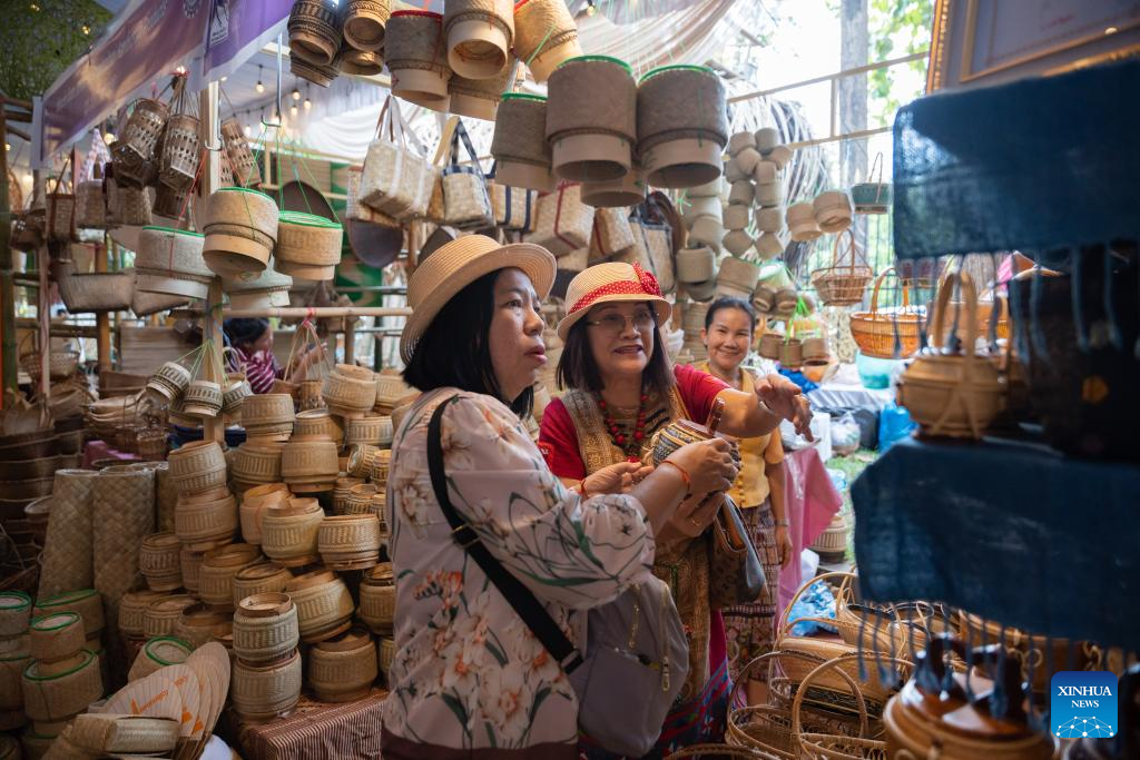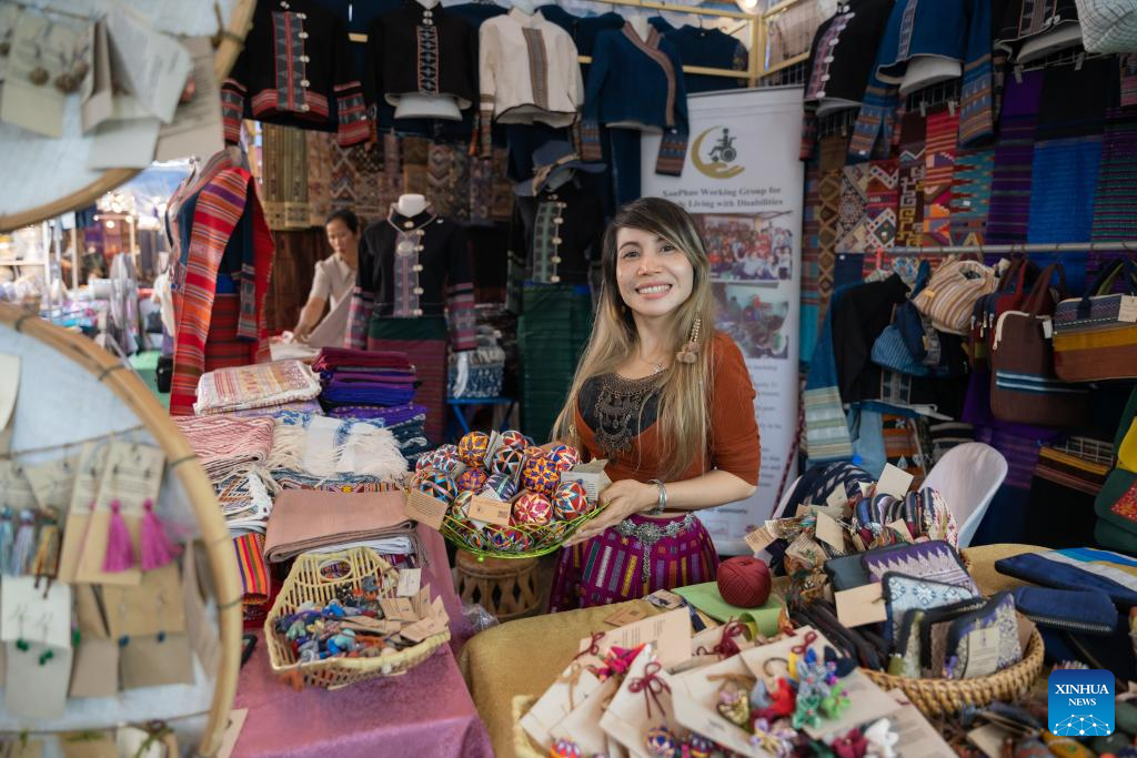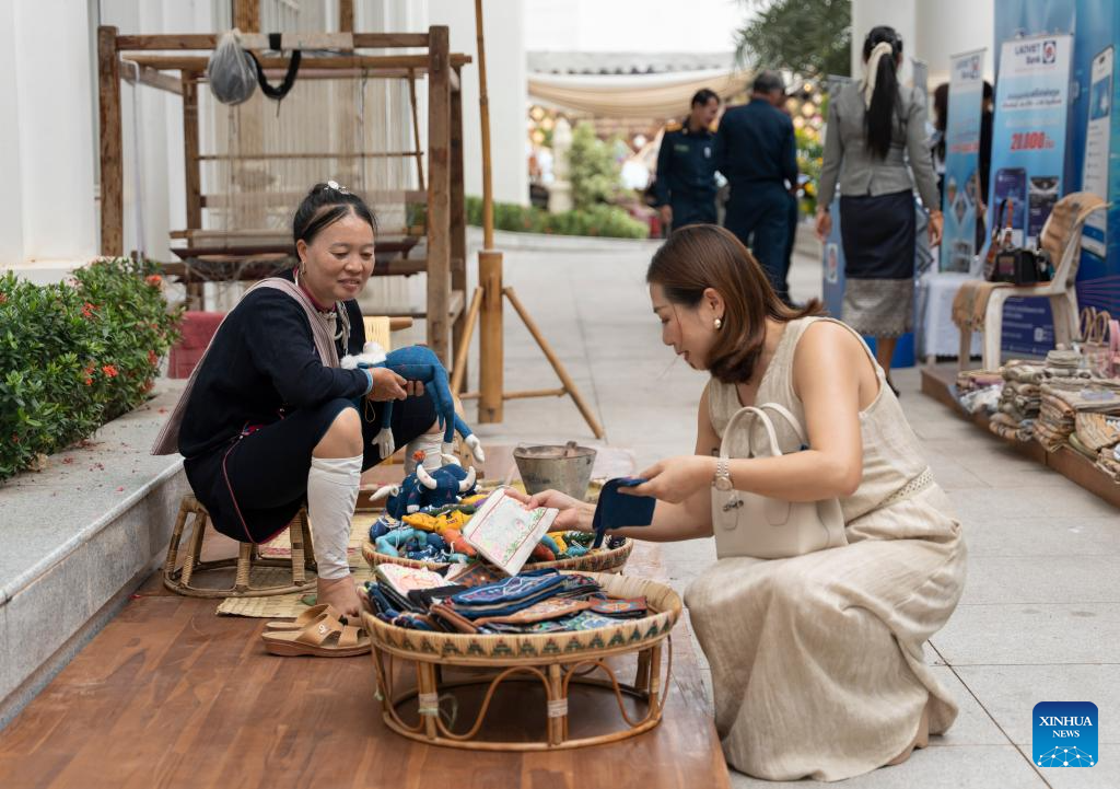 People communicate at a stall during the 24th Lao Handicraft Festival in Vientiane, Laos, Oct. 23, 2025. The festival is held here from Oct. 22 to 26. More than 130 exhibition booths have been set up, displaying textiles, jewellery, pottery, wood carvings, etc. In addition, visitors can enjoy a wide range of interactive cultural experiences during the festival. (Photo by Kaikeo Saiyasane/Xinhua)
