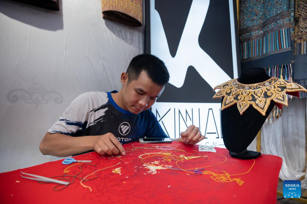 A craftsman works on a textile during the 24th Lao Handicraft Festival in Vientiane, Laos, Oct. 23, 2025. The festival is held here from Oct. 22 to 26. More than 130 exhibition booths have been set up, displaying textiles, jewellery, pottery, wood carvings, etc. In addition, visitors can enjoy a wide range of interactive cultural experiences during the festival. (Photo by Kaikeo Saiyasane/Xinhua)