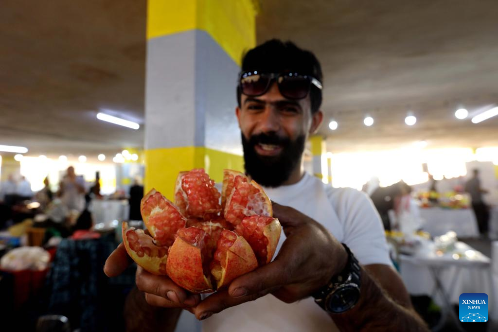 A man shows a pomegranate during the 17th Annual Pomegranate and Rural Products Festival in Irbid, Jordan, Oct. 23, 2025. The festival kicked off here on Thursday. (Photo by Mohammad Abu Ghosh/Xinhua)