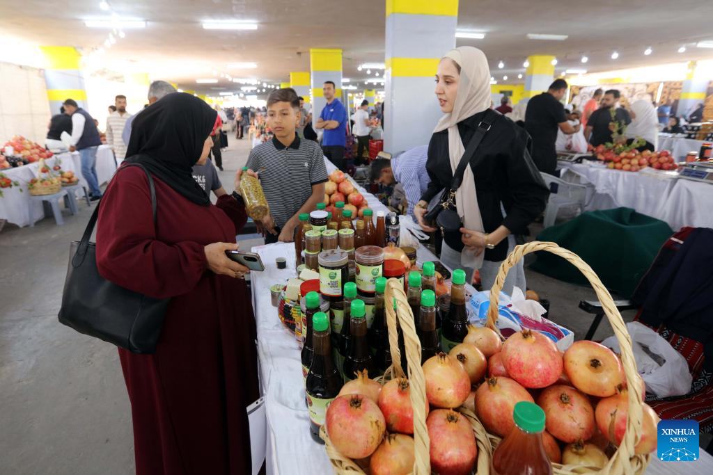 People visit the 17th Annual Pomegranate and Rural Products Festival in Irbid, Jordan, Oct. 23, 2025. The festival kicked off here on Thursday. (Photo by Mohammad Abu Ghosh/Xinhua)