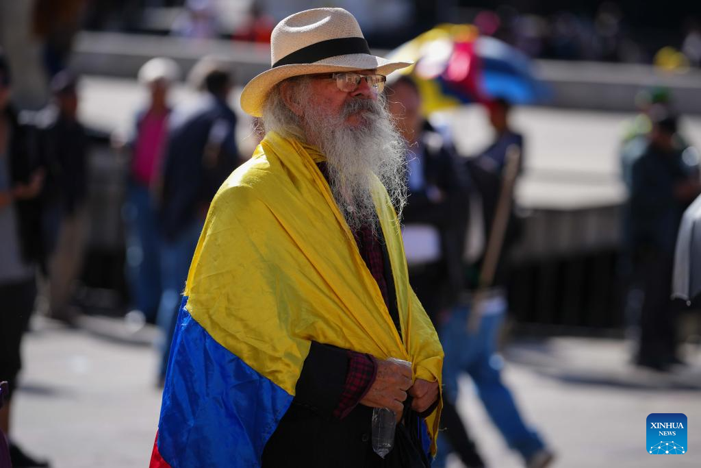 A man attends a rally supporting Colombian President Gustavo Petro at the Plaza de Bolivar in Bogota, capital of Colombia, Oct. 24, 2025. The Trump administration on Friday imposed sanctions on Colombian President Gustavo Petro amid deteriorating bilateral relations, accusing Petro of allowing drug cartels to "flourish," according to a statement from the U.S. Department of the Treasury. (Photo by Andres Moreno/Xinhua)