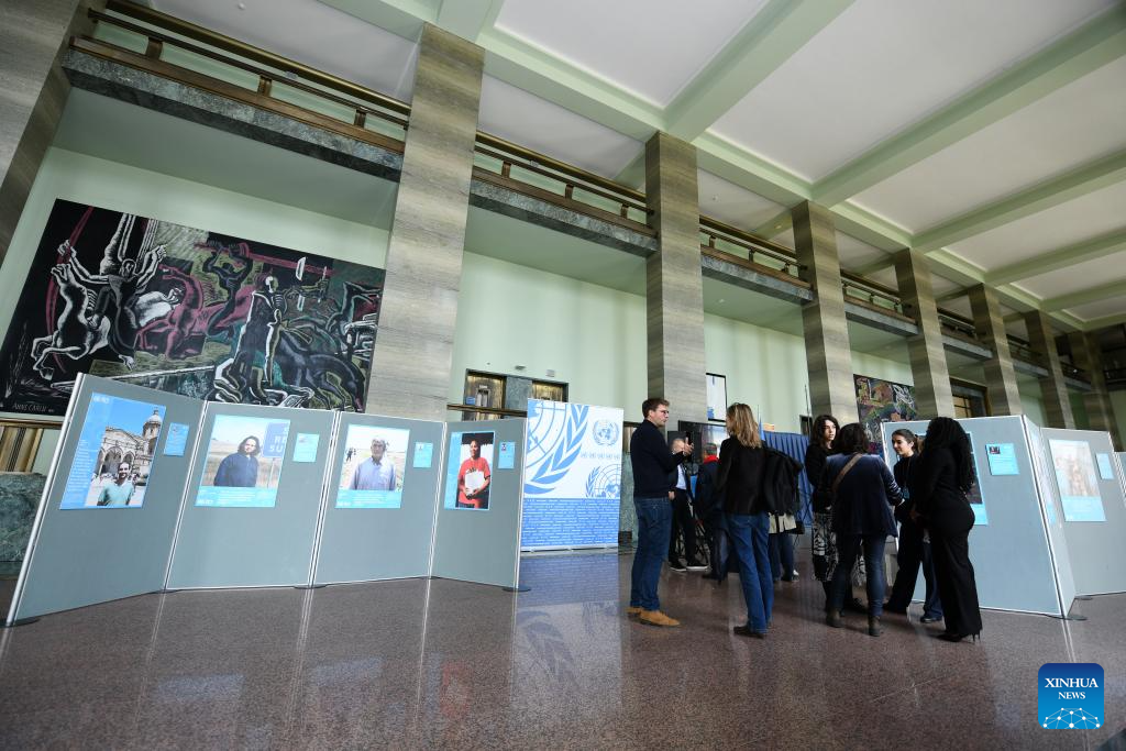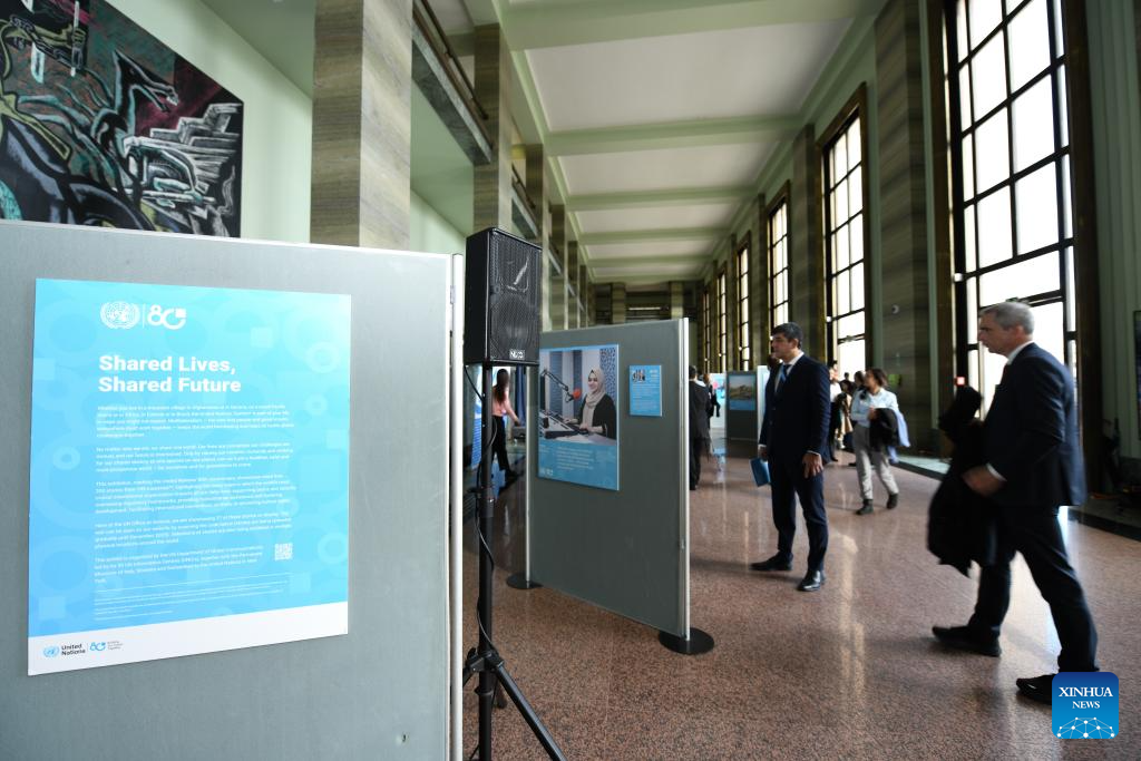 People visit the photo exhibition "Shared Lives, Shared Future" at the Palais des Nations in Geneva, Switzerland, Oct. 24, 2025. A photo exhibition titled "Shared Lives, Shared Future" commemorating the 80th anniversary of the United Nations was opened here at the Palais des Nations on Friday, which coincided with United Nations Day. The exhibition presented 27 stories showing the United Nations made a difference in people's daily lives, from advancing peace and security to providing humanitarian aid. (Xinhua/Lian Yi)