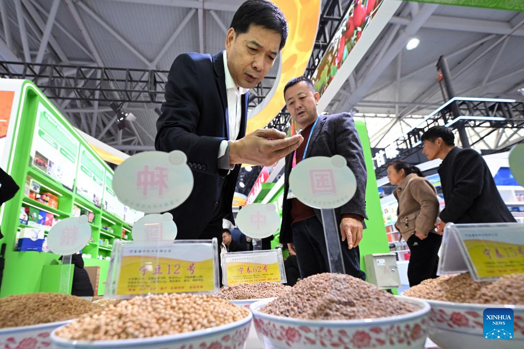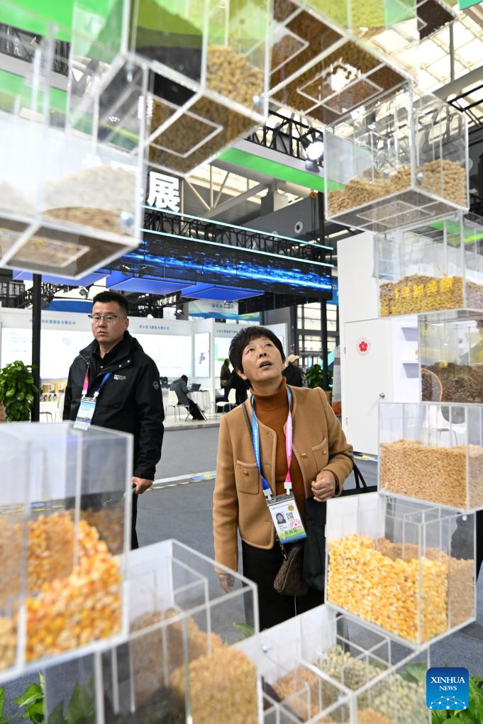 Visitors learn about crop seeds at the 32nd China Yangling Agricultural Hi-tech Fair in Yangling, northwest China's Shaanxi Province, Oct. 25, 2025. Featuring innovations in agricultural high-tech achievements, the 32nd China Yangling Agricultural Hi-tech Fair kicked off here on Saturday. (Xinhua/Li Yibo)