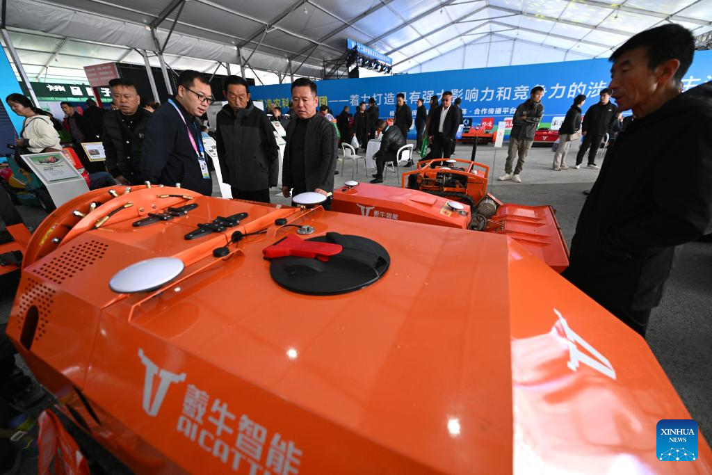Visitors learn about an agricultural robot at the 32nd China Yangling Agricultural Hi-tech Fair in Yangling, northwest China's Shaanxi Province, Oct. 25, 2025. Featuring innovations in agricultural high-tech achievements, the 32nd China Yangling Agricultural Hi-tech Fair kicked off here on Saturday. (Xinhua/Li Yibo)