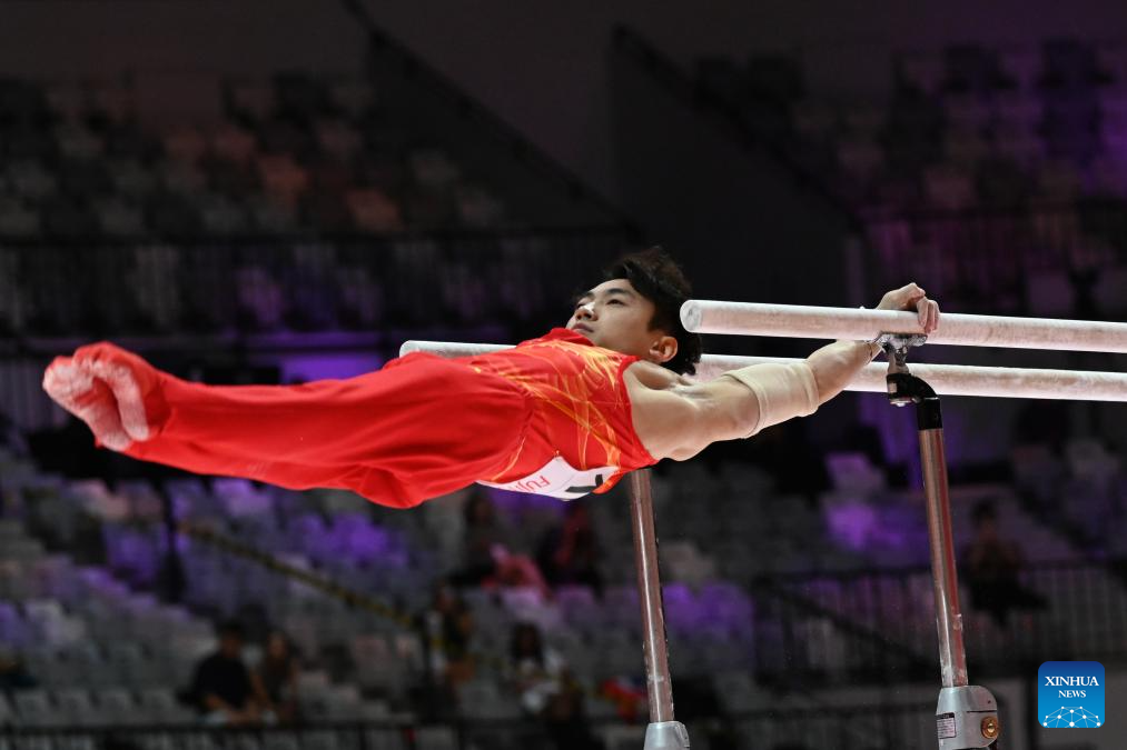 Zou Jingyuan of China competes during the men's Parallel Bars Final at 53rd FIG Artistic Gymnastics World Championships in Jakarta, Indonesia, on Oct. 25, 2025. (Xinhua/Agung Kuncahya B.)